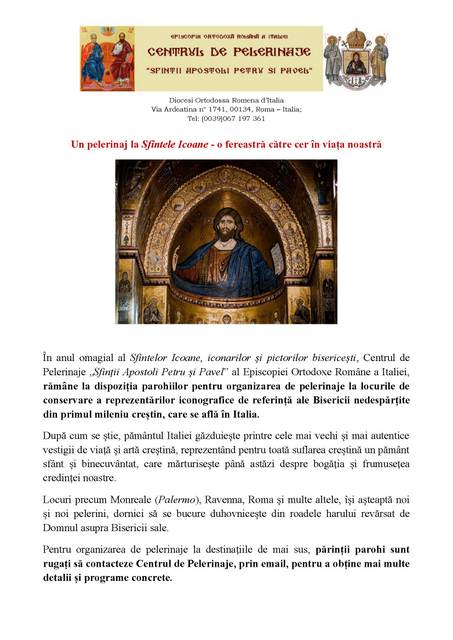 În anul omagial al Sfintelor Icoane, iconarilor și pictorilor bisericești, Centrul de Pelerinaje „Sfinții Apostoli Petru și Pavel” al Episcopiei Ortodoxe Române a Italiei, rămâne la dispoziția parohiilor pentru organizarea de pelerinaje la locurile de conservare a reprezentărilor iconografice de referință ale Bisericii nedespărțite din primul mileniu creștin, care se află în Italia.