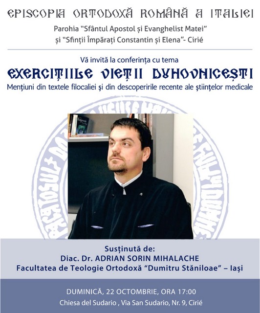 Parohia „Sfântul Apostol și Evanghelist Matei” din Cirié găzduiește duminică, 22 octombrie, cu binecuvântarea Preasfințitului Părinte Siluan, al Episcopiei Ortodoxe Române a Italiei, conferința: „Exercițiile vieții duhovnicești. Mențiuni din textele filocaliei și din descoperirile recente ale științelor medicale”. Prelegerea va fi susținută de Diac. Dr. Adrian Sorin Mihalache, de la Facultatea de Teologie Ortodoxă „Dumitru Stăniloae” din Iași.