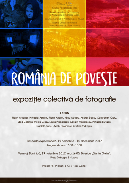 Biserica „Sfânta Giulia”, Piața Suffragio 1 - Lucca va găzdui duminică, 19 noiembrie 2017, de la ora 16:00, vernisajele a două expoziţii colective de fotografie: „România de poveste” şi „Urme ale artiştilor italieni la Iaşi”. Evenimentul este organizat de Clubul Fotografilor Iaşi, având ca parteneri Departamentul pentru Ecumenism al Arhiepiscopiei Catolice Lucca, Uniunea Catolică a Artiștilor Italieni (UCAI), Parohia Ortodoxă Română „Sfântul Antonie cel Mare” - Lucca. Expoziţia colectivă de fotografie „România de poveste” are următorii autori: Florin Aioanei, Mihaela Ajitariţi, Florin Andrei, Nicu Apostu, Andrei Baciu, Constantin Ciofu, Vlad Colotilă, Mirela Grosu, Laura Manolescu, Cătălin Manolescu, Mihaela Burlacu, Daniel Olariu, Ovidiu Porohniuc şi Cristian Vidraşcu. „Am căutat să aducem în faţa publicului o Românie frumoasă, de poveste, din care au plecat milioane de oameni să muncească pentru un trai mai bun. România lăsată acasă poartă încă frumuseţea tradiţiilor moştenite de la înaintaşi, iar partea spirituală dăinuie de sute de ani atât în inimile oamenilor cât şi în bisericile ridicate de-a lungul secolelor”, a spus Constantin Ciofu, organizatorul expoziţiei şi coordonatorul Clubului Fotografilor Iaşi. A doua expoziţie colectivă de fotografie se intitulează „Urme ale artiştilor italieni la Iaşi” şi are ca autori pe următorii membri ai Clubului Fotografilor Iaşi: Florin Aioanei, Mihaela Ajităriţi, Constantin Ciofu şi Daniel Olariu. Cele 20 de lucrări din expoziţia de mai sus au menirea să arate publicului urme ale artiştilor italieni din oraşul Iaşi sau influenţele renaşterii în oraşul celor şapte coline. Evenimentul va fi prezentat de Melania Cristina Cotoi, la acesta fiind invitaţi să participe reprezentanţi ai organizatorilor şi nu numai. Cele două expoziţii vor putea fi urmărite de public în perioada 19 noiembrie – 10 decembrie 2017 (program vizitare: 16:30-18:30). Coordonatorul evenimentului este Daniel Olariu stabilit în oraşul Lucca, membru al Clubului Fotografilor Iaşi.