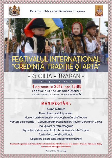Parohia Ortodoxă Română „Sfântul Leon al Cataniei” - filia Trapani, Protopopiatul Ortodox Misionar Sicilia, organizează duminică, 1 octombrie 2017, Festivalul Internaţional „Credinţă, Tradiţie şi Artă” - Trapani, EDIŢIA A II-A. Evenimentul, se va desfăşura cu binecuvântarea Preasfinţitului Părinte Siluan, al Episcopiei Ortodoxe Române a Italiei, şi va începe la ora 16:00 în Biserica „Immaculatella”, Via San Francesco D'assisi - Trapani, Numărul 74 cu o slujbă Te Deum. Programul va continua cu prezentarea portului popular, cu un moment artistic al tinerilor ortodocşi români din Trapani, cu inaugurarea muzeului etnografic, cu o expoziţie de desene realizate de copiii români din Trapani şi cu o tombolă cu premii tradiţionale. În galeria de artă a bisericii va avea loc apoi vernisajul expoziţiei de fotografie – „Costumul tradiţional la români”, semnată de Constantin Ciofu, coordonatorul Clubului Fotografilor Iaşi. „Îi aşteptăm pe toţi credincioşii parohiei noastre să fie prezenţi la acest eveniment de suflet, oragnizat spre slava lui Dumnezeu şi pentru menţinerea tradiţiilor şi obiceiurilor poporului nostru”, a spus părintele paroh Petru Tărăboi. (C. Ciofu)