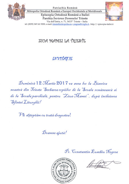 Duminică, 12 martie 2017, va avea loc la Biserica noastră din Trieste, Serbarea copiilor de la Școala Românească și de la Școala parohială, pentru ”Ziua Mamei”, după încheierea Sfintei Liturghii.