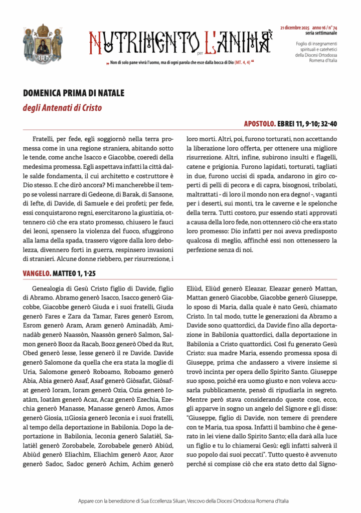 Per grazia di Dio, Vescovo della Eletta da Dio Diocesi Ortodossa Romena d'Italia,