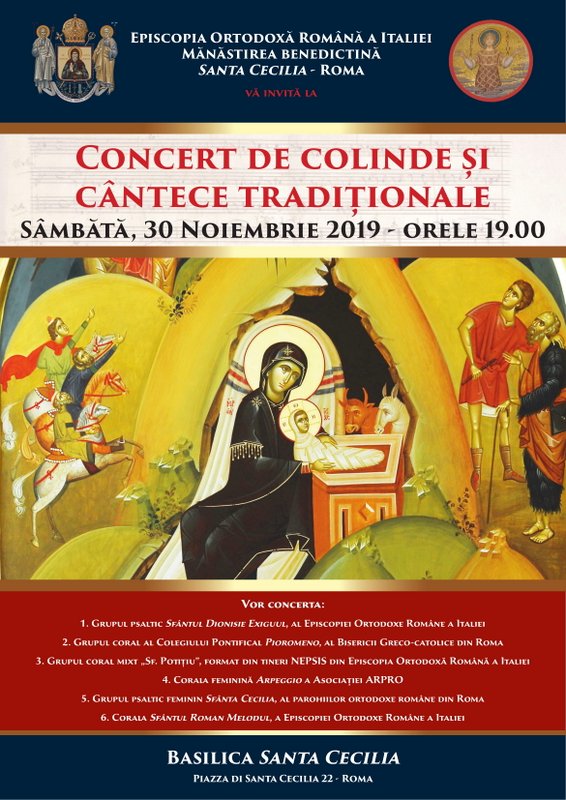 Cu ajutorul Domnului și la inițiativa Preasfințitului Părinte Episcop Siluan, al Episcopiei Ortodoxe Române a Italiei, sâmbătă, 30 noiembrie 2019, de la orele 19.00, va avea loc un concert de colinde și cântece tradiționale, organizat de către Episcopia noastră, în colaborare cu gazda evenimentului, obștea mănăstirii benedictine „Santa Cecilia” din Roma. Concertul se va desfășura în Basilica „Santa Cecilia” din Roma (Piazza di Santa Cecilia N. 22).