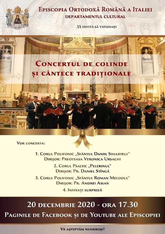 Duminică, 20 decembrie, pe pagina de Facebook și pe canalul YouTube al Episcopiei Ortodoxe Române a Italiei, veți putea urmări un Concert de colinde susținut de câteva dintre corurile din eparhie, dar și de oaspeți dragi.
