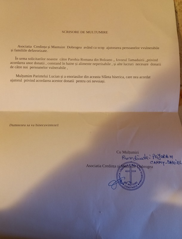 Parohia “ Izvorul Tǎmǎduirii “ din BOLZANO, ȋn urma solicitǎrilor primite din partea Asociaţiei “ Credinţǎ şi mântuire Dobrogea “ o organizat o nouă colectǎ umanitarǎ. Asociaţia din Constanţa are ȋn grijǎ 35 de copii din familii defavorizate şi lor, parohia noastrǎ a reuşit sǎ trimitǎ peste 200 kg. de alimente neperisabile şi ȋmbrǎcǎminte.