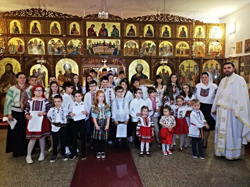 Și mai mititei , și mai măricei , frumos purtând costumul tradițional au participat la Sfânta Liturghie , s-au împărtășit cu Sfintele Taine ale Mântuitorului nostru și apoi au prezentat cântece de laudă ale Învierii in cadrul serbării pregătite cu larg anticip. Mulțumim doamnelor preotese și părinților care au colaborat pentru buna reușită!