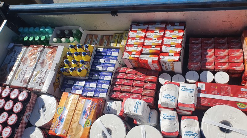 Alimente și produse de igienă personală dăruite de parohia Moncalieri la un dormitor din Torino