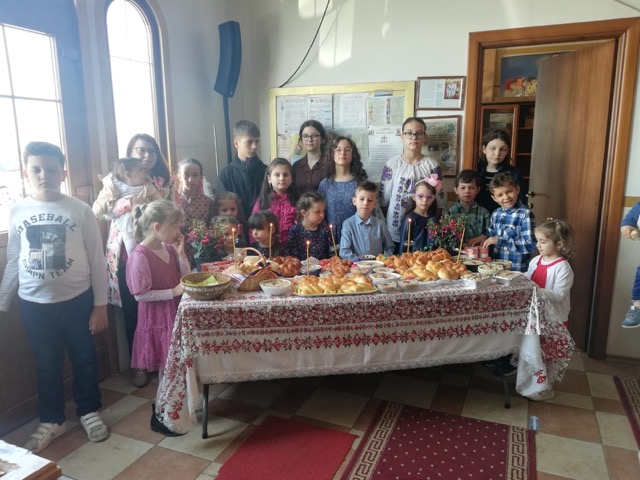 Astfel, în ajunul Duminicii Sfântului Apostol Toma, copiii şi tinerii Școlii Parohiale, îmbrăcați în frumoase ii și costume tradiționale românești, au participat cu bucurie și entuziasm la atelierul gastronomic de împletit colaci si ornat coliva, sub îndrumarea doamnei Elena Lozovan si al doamnei preotese Georgiana Budui. Înainte de a se apuca de treabă, părintele Nicolae Budui le-a vorbit celor prezenţi, printr-o scurtă cateheză, despre simbolismul şi utilizarea colacilor şi al colivei la slujbele de pomenire a celor adormiţi, precum şi de legătura acestora cu Sfânta Liturghie şi Taina Sfintei Euharistii.