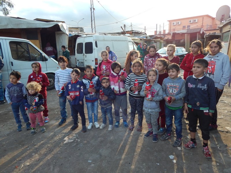 Între timp rămân afară înconjurată de copiii ce țin în mâini darul adus de noi, din care mulți deja gustă cu multă încântare.