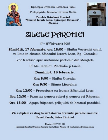 Cu binecuvântarea Preasfințitului Părinte Siluan al Episopiei Ortodoxe Române a Italiei, creștinii Parohiei Ortodoxe Române „Sfântul Ierarh Leon, Episcopul Cataniei” - Alcamo, Provincia de Trapani, il vor cinsti pe Ocrotitorul parohiei, în Biserica „San Vito” din Piazza „San Vituzzo”, Alcamo.