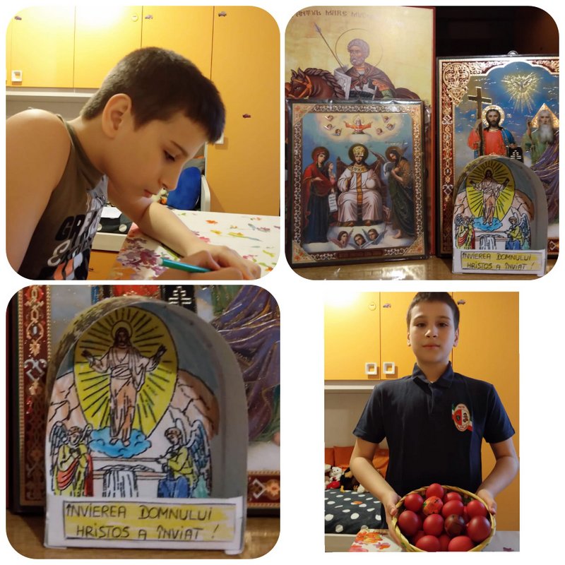 Alaturi de ei, grupa mică, prin cei 39 de copilasi, au cantat fiecare, la altarul de acasa, HRISTOS A INVIAT, pregatind si cosuletul cu oua incondeiate.