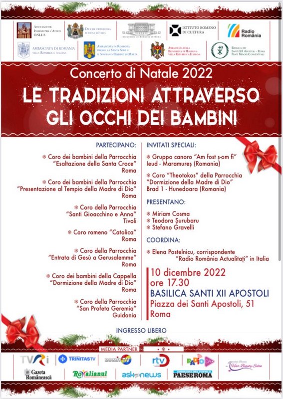 Sâmbătă, 10 decembrie 2022, ora 17:30, Asociația italiană “Insieme per l’Athos–Onlus”, Accademia di Romania in Roma, Episcopia Ortodoxă Română a Italiei și Radio România, cu patronajul Ambasadei României în Republica Italiană, al Ambasadei României pe lângă Sfântul Scaun și al Ambasadei Republicii Moldova în Italia, prezintă cea de-a VII-a ediție a Concertului de Crăciun intitulat „Tradiții prin ochi de copii”.