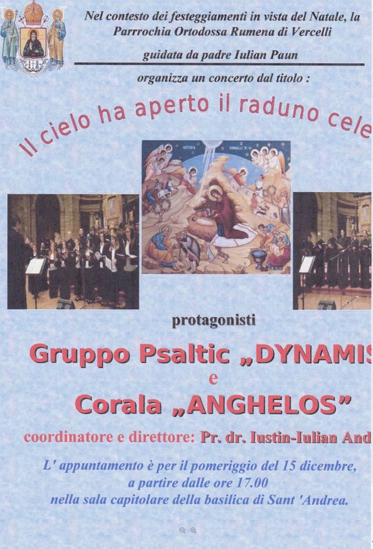 Spectacolul se va ține în Sala Capitulară din ansamblul Bazilicii Sfântul Andrei din orașul Vercelli și îi va avea ca protagoniști pe membrii corului Dynamis și Anghelos din orașul Torino sub bagheta părintelui Iustin Androne.