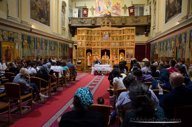 După Acatistul Sfântului Ierarh Nectarie, cu prilejul căruia toţi cei prezenţi s-au închinat la o părticică din sfintele sale moaşte, Părintele protopop Lucian Roşu a urat bun-venit în mijlocul comunităţii noastre a celui ce „ prin intermediul revistei pe care o coordonează, este mereu prezent în sânul acestei familii ortodoxe de aici ”. A urmat apoi conferinţa propriu-zisă, a cărei temă, destul de provocatoare, a stârnit interesul multor preoţi şi credincioşi din parohii ale Protopopiatului Piemonte I – Valle d’Aosta, Centru – Nord.