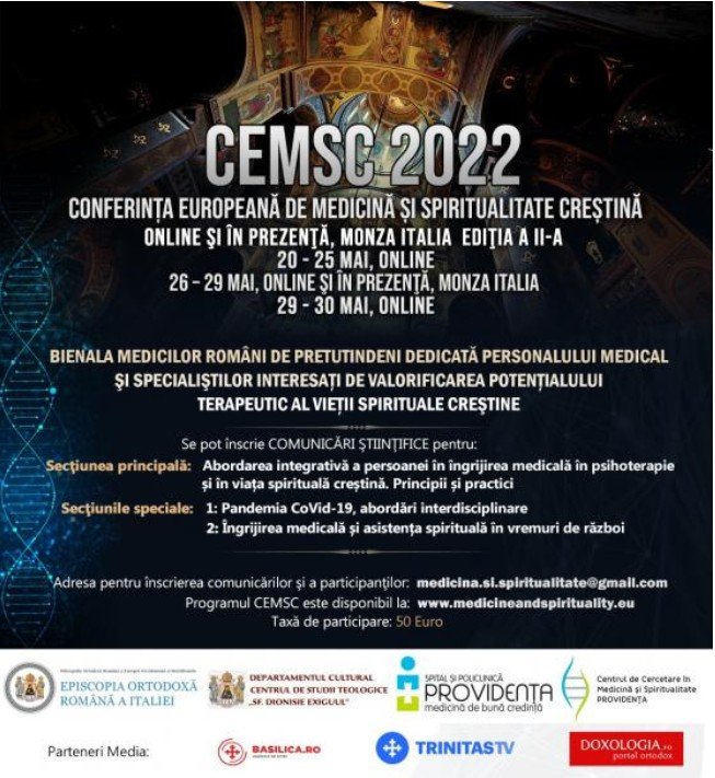 Centrul de Cercetare în Medicină și Spiritualitate Creștină – Spitalul „Providența” Iași, din cadrul Mitropoliei Moldovei și Bucovinei, în cooperare cu Episcopia Ortodoxă Română a Italiei și Centrul de Studii Teologice „Sfântul Dionisie Exiguul” din Italia, organizează, în perioada 20-30 mai 2022, Conferința Europeană de Medicină și Spiritualitate Creștină (CEMSC 2022).