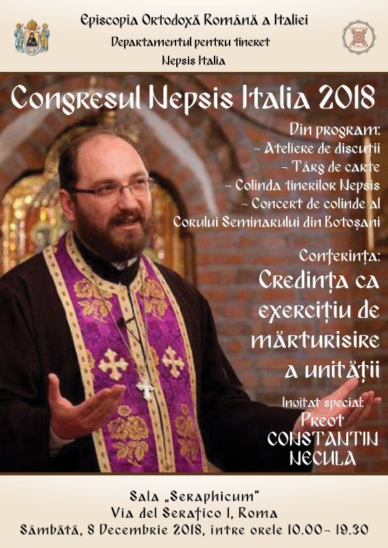 Cu binecuvântarea Preasfințitului Siluan, azi 8 decembrie 2018, începând cu orele 10.00, la Sala SERAPHICUM – Roma, va fi CONGRESUL ANIVERSAR NEPSIS ITALIA, unde sunt invitați să participe tinerii Nepsis din parohiile frățiilor voastre.
