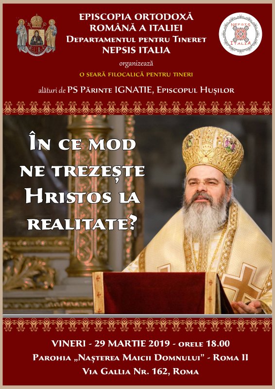Cu ajutorul Domnului, binecuvântarea Preasfințitului părintelui nostru Siluan în cadrul programului Serile Filocalice, Nepsis Roma, invită tinerii la o altă seară specială, de data aceasta cu Preasfințitului părinte Ignatie, episcopul Hușilor.