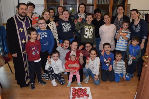 La atelierul Şcolii Parohiale din Rovigo, copiii şi părinţii lor, ajutaţi de doamna preoteasă Georgiana Budui, au lucrat cu multă atenţie şi dăruire la încondeierea şi vopsirea ouălor de Paşti, pe care le vor aşeza la Denia din Joia Mare lângă crucea Domnului Hristos. De asemenea, cei mai harnici dintre ei au lucrat şi câteva frumoase aranjamente ce ilustrează dealul Golgotei şi cele trei cruci, precum şi mormântul în care a fost aşezat Iisus şi a treia zi a înviat.