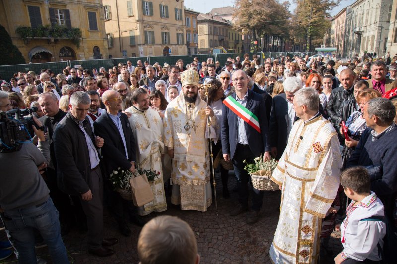 Emoția și biserica plină sunt un obicei la Reggio, dar de aceasta dată șirul credincioșilor a umplut și piața din fața lăcașului religios. Oamenii, chiar și cei care nu înțeleg limba românească, au ascultat cu smerenie rugăciunile preoților însoțite de cântările psaltice ale stranei. “E atât de frumoasă slujba! Ce cântări! Ce biserică este asta?”, întrebau italieni plecați de acasă cu alte treburi, dar care au decis să asculte și să privească până la capăt slujba comunității românești. Care comunitate a contribuit în proporție de 70 la sută la renovarea fațadei clădirii ce e monument istoric cultural al Italiei. Ne respectă și pentru asta. În fapt, eforturile părintelui Mihail Ciocîrlan în acest sens, dar și cele pentru ajutorarea familiilor din Moldova de-a stânga și de-a dreapta Prutului, prin acțiunea umanitară “Caravana dăruirii”, i-au adus recunoașterea, acesta fiind hirotesit “iconom”.