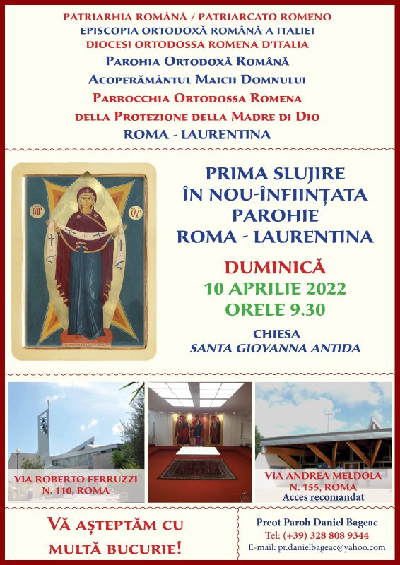 Cu binecuvântarea Preasfințitului Părinte Episcop Siluan al Episcopiei Ortodoxe Române a Italiei, s-a înființat o nouă parohie, pusă sub ocrotirea Acoperământului Maicii Domnului, cu responsabilități pastoral-misionare pentru zona Roma Laurentina. Prima slujire în nou-înființata comunitate parohială va avea loc Duminică, 10 aprilie 2022, începând cu orele 9.30, spațiul de slujire fiind pus la dispoziție de către comunitatea catolică „Santa Giovanna Antida”, din Via Andrea Meldola n. 155, Roma (sau Via Roberto Ferruzzi n. 110, Roma).
