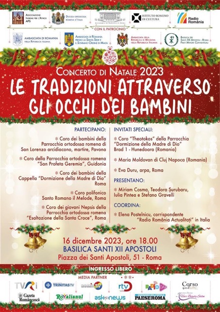 Sâmbătă, 16 decembrie 2023, de la ora 18:00, la Basilica dei Santi XII Apostoli, (Piazza dei Santi Apostoli, nr. 51), din Roma, va avea loc cea de-a VIII-a ediție a Concertului de colinde „Tradiții prin ochii copiilor”. Concertul este organizat de Asociația „Împreună pentru Athos”, în colaborare cu Academia Română din Roma, Episcopia Ortodoxă Română a Italiei și postul național românesc de radio „Radio România”, cu patronajul Ambasadei României în Italia, Ambasadei României pe lângă Sfântul Scaun și Ambasadei Republicii Moldova în Italia.