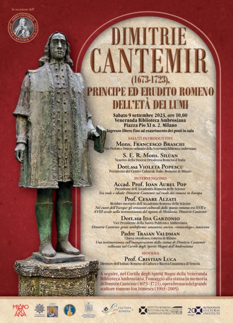 Sâmbătă, 9 septembrie 2023, începând cu ora 10:00, la prestigioasa Bibliotecă Ambroziană din Milano, va avea loc un eveniment cultural și academic, cu ocazia a 350 de ani de la nașterea marelui cărturar român de faimă european, Dimitrie Cantemir (1673-1723), domn al Moldovei (1693, 1710-1711). Evenimentul se înscrie în manifestările „Anului Cultural Dimitrie Cantemir” și este organizat de Centrul Cultural Italo-Român, Biblioteca Ambroziană din Milano și Institutul Român de Cultură și Cercetări Umanistice din Veneția. Evenimentul se bucură de patronajul Ambasadei României în Italia.