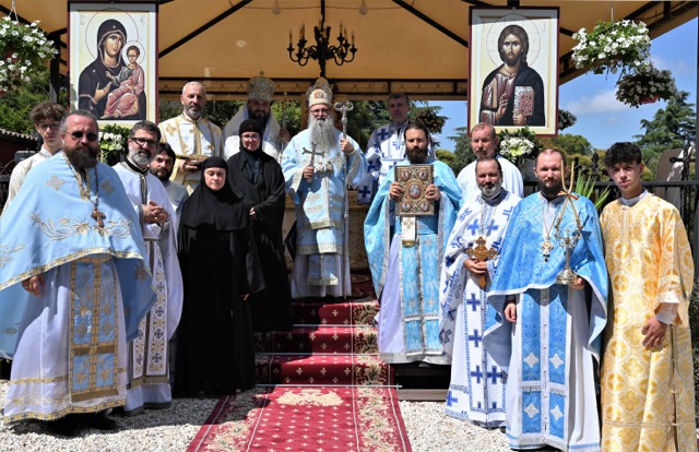 La acest moment aniversar, Preasfințitul Părinte Episcop Siluan al Episcopiei Ortodoxe Române a Italiei, avându-i alături pe Preasfințitul Părinte Arhiereu Vicar Atanasie de Bogdania și un sobor de preoți și diaconi, au săvârșit Dumnezeiasca Liturghie pe un podium special amenajat în curtea mănăstirii, înconjurați de mulțimea de credincioși și pelerini care au venit să aducă mulțumire și laudă Maicii Domnului.