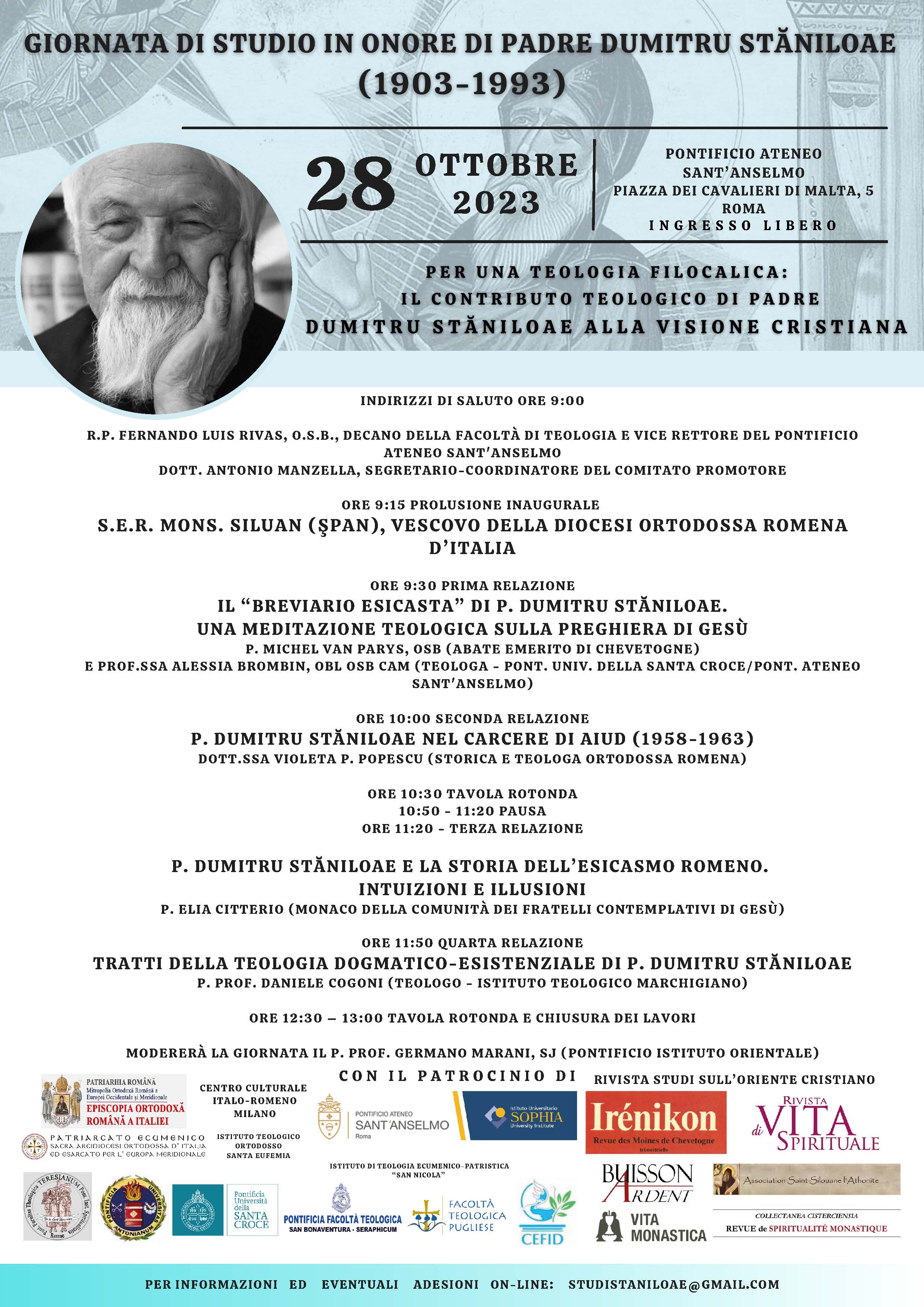 La Giornata di Studio "Per una Teologia Filocalica: il contributo teologico di Padre Dumitru Stăniloae alla visione cristiana" è un'occasione per approfondire il pensiero e l'eredità di Padre Dumitru Stăniloae (1903-1993). L’evento si svolgerà sabato 28 ottobre 2023 presso il Pontificio Ateneo Sant'Anselmo di Roma.