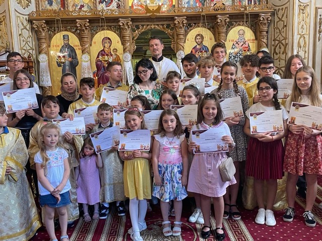 Duminica Tuturor Sfinților a fost prilej de emoție și bucurie pentru tinerii și copiii din parohia noastră. După terminarea Sfintei Liturghii, elevii Școlii Parohiale, părinții lor și întreaga comunitate au participat la festivitatea de încheiere a anului catehetic. Tuturor participanților li s-au oferit diplome, iar cei cu rezultate deosebite au fost premiați cu bilete în tabăra de vară a Protopopiatului nostru.