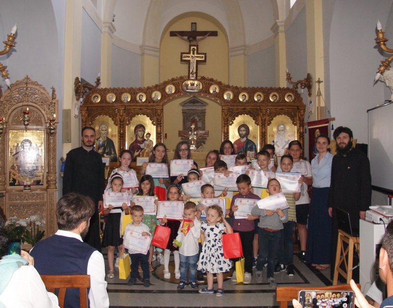 Copiii au primit dosarele cu lucrări pe care le-au desfășurat in timpul anului, puse la dispoziție in fiecare duminică si sărbători prin osteneala membrilor Departamentului pentru Cateheză al EORI. După premierea copiilor din cele două grupe - Sf. Nicolae, alcătuită din copiii mici si Sf. Ioan Gură de Aur a celor mari - toți cei prezenți s-au bucurat de fotografii de la minunatele momente petrecute împreună in cei aproape 9 ani de la înființarea parohiei.
