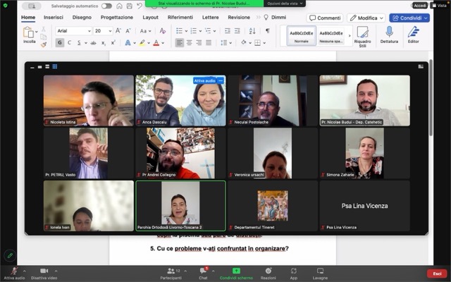 La această întâlnire online au participat organizatorii de tabere din protopopiatele: Piemonte 1, 2 și 3, Triveneto 2 și 4, Emilia Romagna 1, Toscana 2, Lazio 1 și Abruzzo.