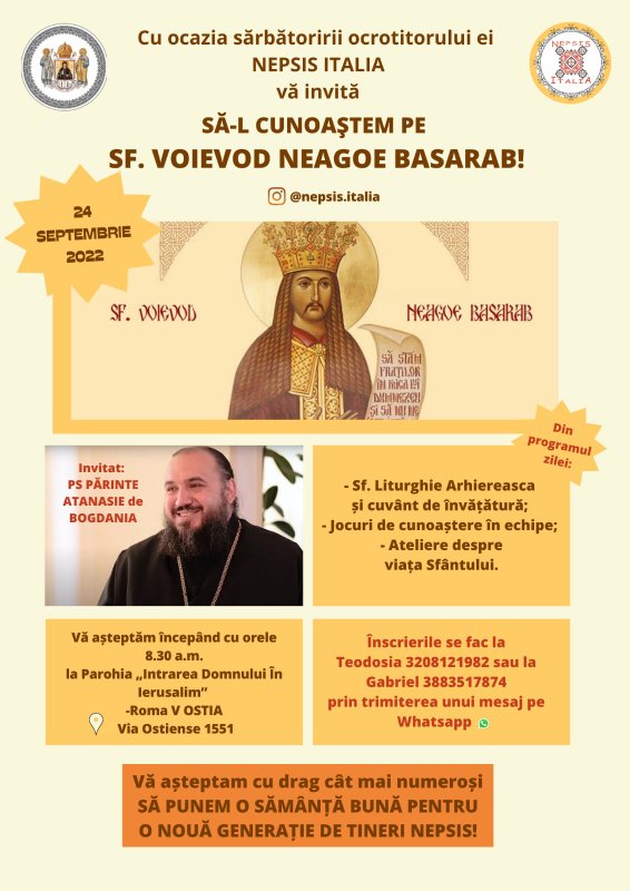 În ziua de sâmbătă, 24 septembrie 2022, va fi organizată Întâlnirea Tinerilor Nepsis din zona Lazio la care va participa ca invitat Preasfințitul Părinte Atanasie de Bogdania, Arhiereul-Vicar al Episcopiei Ortodoxe Române a Italiei.