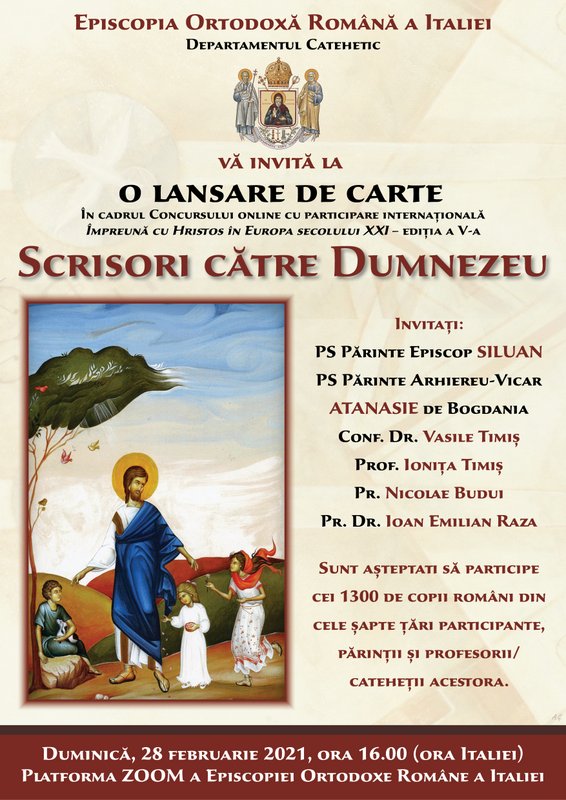 Cu binecuvântarea Preasfințitului Părinte Episcop Siluan, al Episcopiei Ortodoxe Române a Italiei va avea loc duminică, 28 februarie 2021, ora 16.00 (ora Italiei), respectiv ora 17.00 (ora României) lansarea cărţilor cu titlul “Scrisori către Dumnezeu”, cuprinzând scrisorile celor 1300 de copii romani din sapte ţări ale Europei care au participat în data de 19 decembrie 2020 la a V-a ediţie a concursului online cu participare internațională Împreună cu Hristos în Europa secolului XXI, organizat de Episcopia Ortodoxă Română a Italiei.