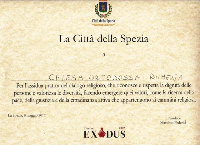 Cu binecuvântarea Preasfințitului Părinte Episcop Siluan am fost delegat în anul 2015 ca reprezentant al Bisericii Ortodoxe Române din La Spezia să particip la ședințele bilunare ce se desfășoară în cadrul Primăriei cu tema Consulta delle Comunita delle Religioni delle cita della Spezia. Cu ocazia premiului EXODUS 2017 care se desfășoară anual, în această lună Biserica Ortodoxă Sfântul Chiril al Alexandriei din La Spezia a fost premiată de către Domnul Primar Massimo Federici cu o diploma și medalie pentru participarea sârguincioasă a dialogului religios, care recunoaște și respectă demnitatea persoanelor și valorizează diversitatea lor, arătând acele valori, precum căutarea păcii, a justiției și a cetățeniei active care aparțin căilor religioase. Mulțumesc pe această cale comunității Creștin Ortodoxe din La Spezia și Pontremoli pentru sprijinul acordat in desfășurarea acestor activități, cu diverse materiale, idei de cultura și tradiție.