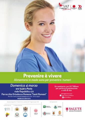 Cu binecuvântarea Preasfințitului Părinte Episcop Siluan, la Parohia “Sfinții Români” din Pavia, duminică 4 martie, după Sf. Liturghie, a avut loc al doilea Seminar cu Lega Italiana per la Lotta contro i Tumori di Milano (LILT). Tema abordata „Sa ne alimentam sanatos pentru a preveni tumorile”. Au fost evocate rezultatele obtinute de catre Fondul mondial pentru cercetarea cancerului (WCRF). Durata 2 ore.