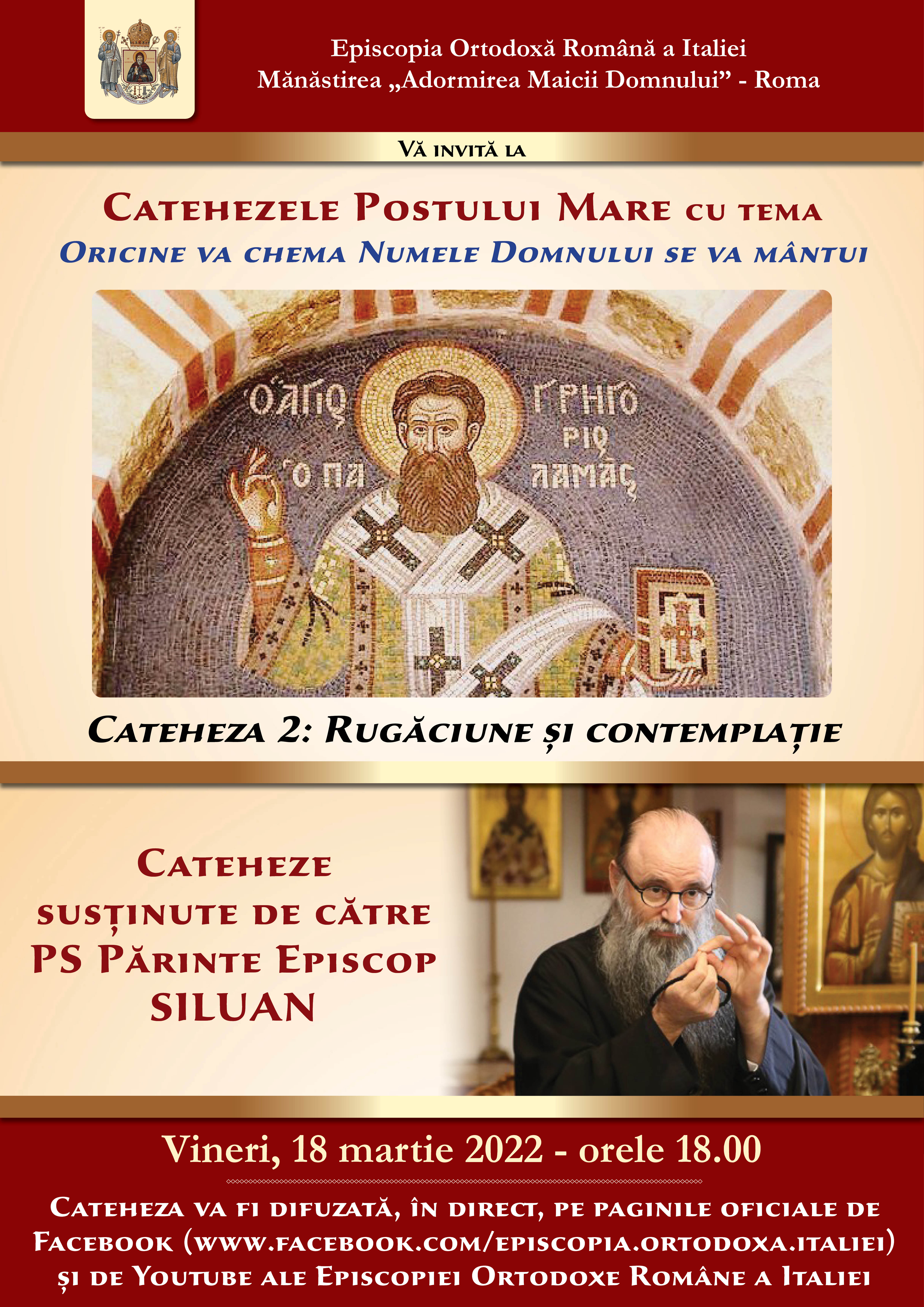 Vineri, 18 martie 2022, pe platformele mediatice ale Episcopiei Ortodoxe Române a Italiei, s-a desfășurat a doua cateheză din Postul Mare cu titlul: Rugăciune și contemplație – Oricine va chema Numele Domnului se va mântui. Tematica acestor cateheze pornește de la un verset din cartea prorocului Ioil, capitolul 3, versetul 5, respectiv F. Ap. 2, 21 și Rom. 10, 13: „Oricine va chema Numele Domnului se va mântui”.