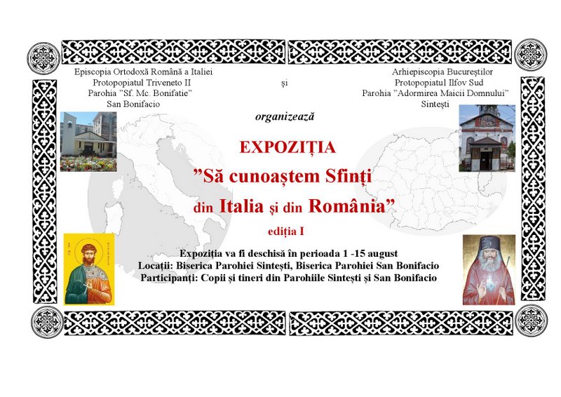În perioada 1-15 august, în bisericile parohiilor Sintești și San Bonifacio va avea loc expoziția "Să cunoaștem Sfinți din Italia și din România", unde vor fi expuse lucrările copiilor participanți la proiect.