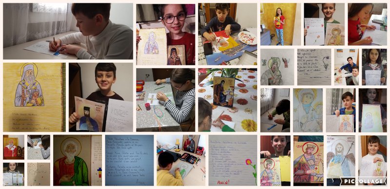Iar, ca activitate practică le-am propus proiectul "Pe urmele Sfântului meu ocrotitor" prin care i-am îndemnat să deseneze icoana Sfântului lor ocrotitor și, de asemenea, să adreseze Sfântului ales câte o scrisoare sau o poezie. Toate lucrările copiiilor au fost trimise prin e-mailul parohiei noastre și le-am așezat într-un frumos film video, iar apoi vor fi publicate în revista parohială, pe care copiii și familiile lor, prin intermediul tehnologiei, o pot vedea.