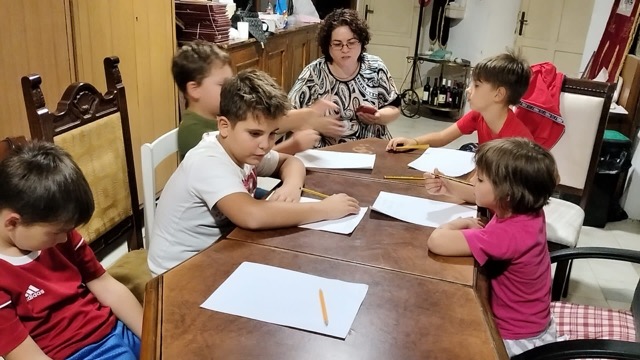 Copiii Scolii Parohiale la orele de Limba Română, Religie și Muzică în condiții de șantier, de renovare a sălilor parohiale de curs din cadrul Complexului religios al Parohiei Ortodoxe Române „ Sf. Ierarh Ghelasie de la Râmeț” din orașul Rimini.