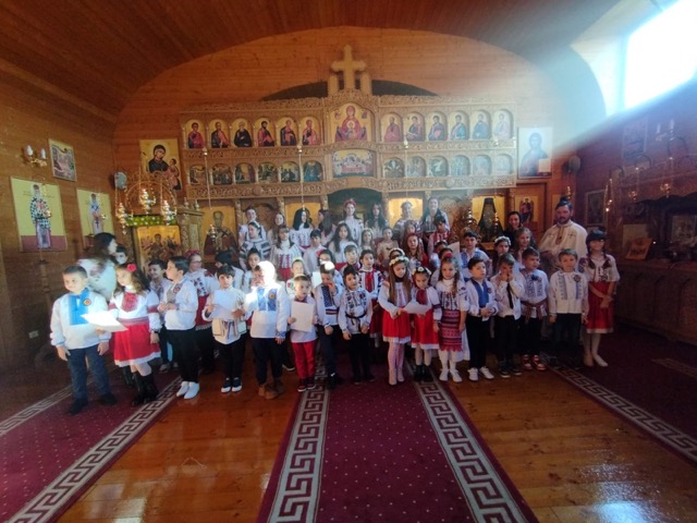 Copiii Școlii Parohiale, conduși de doamna Preoteasă Alina Secită, au cântat imnul României, cântece și poezii patriotice.