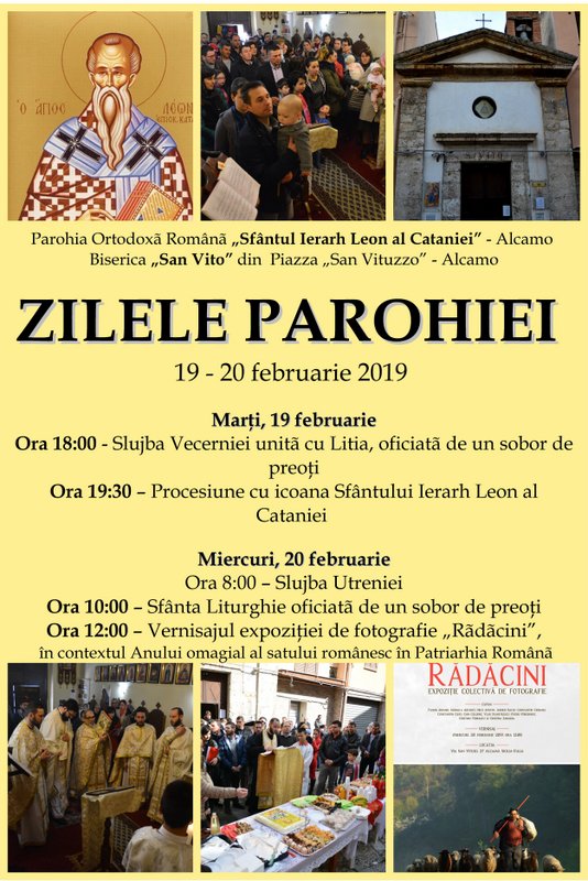 Parohia Ortodoxă Română „Sfântul Ierarh Leon al Cataniei” - Alcamo, Provincia de Trapani, îşi cinsteşte ocrotitorul în zilele de 19 şi 20 februarie 2019. În Biserica „San Vito” din Piazza „San Vituzzo” - Alcamo, manifestările religioase şi culturale vor debuta