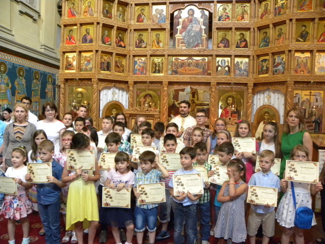 Părintele Gabriel Burcescu a înmânat, din partea parohiei, fiecărui copil câte o diplomă de merit pentru prezenţa constantă la orele de catehism şi a felicitat pe doamnele preotese Amalia Roşu, Adriana Burcescu şi pe domnişoara profesoară Adriana Chirilă pentru dăruirea, dragostea şi grija pe care o au faţă de aceşti copii dornici de a cunoaște credinţa în care s-au născut şi de a menţine o legătură vie cu Dumnezeu.
