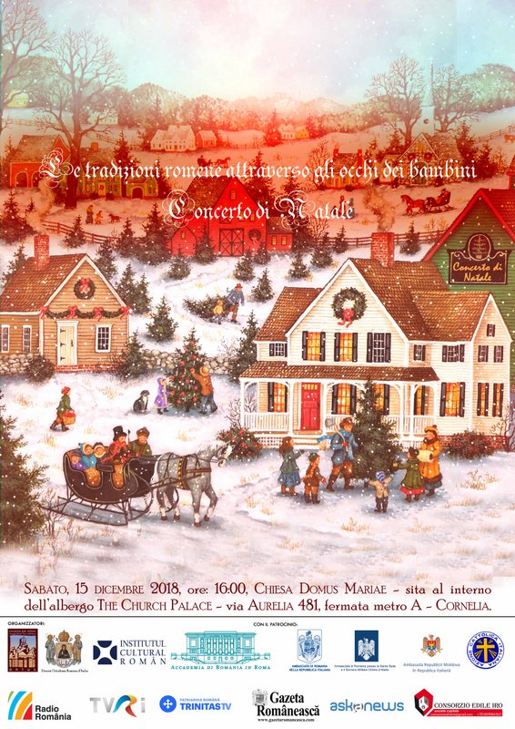 Asociația “Insieme per l’Athos – onlus” în colaborare cu Episcopia Ortodoxă Română a Italiei și Accademia di Romania la Roma organizează cea de-a treia ediție a Concertului de Crăciun intitulat ”Tradiții prin ochi de copii”. La eveniment, care va avea loc în după-amiaza zilei de sâmbătă, 15 decembrie 2018, în Biserica Domus Mariae, din interiorul hotelului “The Church Palace “ (via Aurelia n.481), vor participa opt coruri din diferite parohii ortodoxe și catolice: Corul Parohiei Înălțarea Sfintei Cruci (Roma), Corul San Potito (Roma), Corul Parohiei “Intrarea Domnului în Ierusalim” (Roma), Corul Parohiei “Sfântul Proroc Ieremia” (Guidonia), Corul Parohiei ”Sfântul Proroc Ilie Tesviteanul” (Rignano Flaminio), Corul Parohiei Sfantul Nicolae (Orvieto), Corul Parohiei “Sfântul Mare Mucenic Mina” (Palestrina) și corul românesc“Cattolica”(Roma). În acest context va cânta și grupul Arpeggio&Roua, corul de copii “Cantus Mundi”, soprana Daniela Maria Dumitru (Iasi) și interpreta Elena Lazăr din Roma. În concert este prevăzută și participarea extraordinară a grupului de colindători “Am fost ș-om fi” din Ieud, județul Maramureș (România) împreună cu maestrul Dumitru Dobrican.