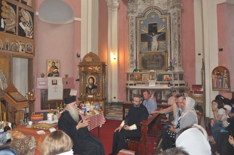 Vineri, 25 mai 2018, în Parohia „Sfântul Ioan Gură de Aur” din Carrara s-a săvârșit Taina Sfântului Maslu, iar la final a avut loc o seară duhovnicească împreună cu Părintele Damaschin, călugăr grec de la Mănăstirea Grigoriu din Sfântul Munte Athos-Grecia. Părintele are 43 de ani ca viețuitor la Sfântul Munte și a cunoscut mari duhovnici români: Paisie, Cleopa, Ioanichie, Teofil. Din dragoste față de cartea Patericul român a cerut binecuvântare de la Stareț să învețe limba română. Aprobarea i-a venit abia după trei ani. Prima carte tradusă din limba greacă în limba română a fost tocmai Patericul român, apoi s-au adăugat și alte cărți, numărul traducerilor ridicându-se până-n prezent la 36 de cărți. Cu mult drag, Părintele Damaschin, mi-a spus deschis că este singurul grec care iubește așa de mult nația română. Ascultându-l pe Părintele Damaschin, mi-am dat seama că nu există numai o frumusețe a tinerețiiꓼsfânta bătrânețe își are și ea prospețimea ei, lumina sa, culoarea și floarea ei. Această frumusețe este cea a sufletului: luminoasă în interior. Ortodoxia nu este numai o religie în care îmbătrânești mai devreme pentru a muri mai bătrânꓼeste și cea în care îmbătrânești mai repede pentru a deveni mai frumos. Mulțumiri Părintelui Mihai Anton de la Prato, împreună cu care am săvârșit Sfântul Maslu și Părintelui Protopop Ciprian Calfa de la Protopopiatul Toscana 2 care a gândit aducerea Părintelui Damaschin în Italia.