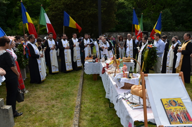Cu binecuvântarea Preasfințitului Episcop Siluan, preoții și credincioșii din parohiile protopopiatului Triveneto 1 s-au adunat ca în fiecare an, în prima duminică înainte de sărbătoarea Înălțării Domnului, la unul din cimitirele militare din zona protopopiatului nostru. Astfel până acum am cercetat Cimitirele militare din Brunico, Dobiaco, Palmanova, Redipuglia, Brazzano unde s-au depus coroane de flori și s-au făcut slujbe de pomenire. Anul acesta însă ne-am adunat în după amiaza zilei de duminica 21 mai, la Cimitirul Austro-ungar din Prosecco, o localitate în apropiere de Trieste, pentru a săvârși slujba Parastasului pentru toți eroii martiri și soldați căzuți în razboaie, dar în mod special pentru cei înmormântați aici ce au murit în Primul Razboi Mondial. Facem acest pelerinaj și aceasta pomenire în fiecare an, nu doar pentru că avem compasiune pentru acești frați ai noștri căzuți în luptă, ci și pentru faptul că vrem să ne rugăm pentru odihna sufletelor lor și aici departe de țara mama. Prin săvârșirea acestor slujbe de pomenire, manifestăm pe de o parte credința noastră în viața veșnică, și cerem Domnului să-i odihnească pe toți acolo unde luminează lumina feței Sale, dar pe de altă parte se nasc inimile noastre sentimente și trăiri înălțătoare ale iubirii de Dumnezeu, de Neam şi de Patrie Pe de altă parte prin aceste slujbe de pomenire ne cinstim istoria și trecutul nostru ca neam, creându-se astfel o legătura neîntreruptă cu cei care și-au dăruit viața lor în trecut, pentru existența noastră de astăzi. Apoi se creează o legătură mai puternică între noi cei din diaspora și întreg neamul nostru și ni se dă un sens de continuitate și unitate care se transmite din generație in generație. Pe lângă preoții și credincioșii noștri, la acest eveniment au participat, Domnia Sa Consulul Laurențiu Babei reprezentant al Consulatului din Trieste, domnul Marco Gabrielli Președintele Consiliului Comunal din Trieste, doamna Președintă a Circumscripției 1 Trieste Maja Tenze, precum și alți reprezentanți ai autorităților locale italiene precum și reprezentanți ai poliției locale. Istoria acestui cimitir începe în noiembrie 1915 când la Prosecco era un spital militar de campanie, iar cei căzuți în luptă și cei morți din cauza rănilor primite, au fost înmormântați în cimitirul civil al localității, apoi în octombrie 1916 se începe construirea unui cimitir ad hoc, aproape de cel civil și un altul pe locul unde este actualul cimitir. Acesta cimitir se află într-o vale foarte frumoasă și înconjurată de pădure și a fost reamenajat de mai multe ori, aducându-se aici și rămășițele pământești ale soldaților căzuți din alte cimitire mai mici: Opicina, Banne, Basovizza, Doberdò e Piedimonte del Calvario. Cu putini ani în urma Asociația Crucea Neagra Austriacă care se îngrijește de soldații căzuți în războaie, a așezat cruci noi de piatra determinând aspectul actual al cimitirului. În acest cimitir se odihnesc 5733 de soldați de diverse naționalități, dintre care doar pentru 578 se cunosc numele. Dintre aceștia au fost identificați 42 de români, dar având în vedere că inscripțiile cu numele celor căzuți au fost transcrise de mai multe ori, acestea au primit o puternică influență austriacă și maghiară. Am descoperit pe unele cruci nume asemănătoare cu cele care încă se mai întâlnesc în Ardeal, apoi între cei la care nu s-au mai păstrat numele cu siguranță ca au mai fost și alți frați de ai noștri. La această slujbă am simțit în inimă un sens de recunoștință fără margini, ce nu poate fi rostit în cuvinte, iar rugăciunea noastră acolo lângă crucile simple a soldaților căzuți, exprimă compasiunea, duiosia, înţelegerea şi recunoştinţa faţă de acești frați ai noștri, morți fără o vorbă mângâitoare, fără o lumânare aprinsă la căpătâi, departe de țară și de cei dragi. Slujba s-a încheiat cu depunerea de coroane de flori lângă crucea din mijlocul cimitirului, cu intonarea Imnelor Italiei, României și Moldovei, însoțite de un recital de cântece patriotice și o agapă frățească la care au participat toți cei prezenți.