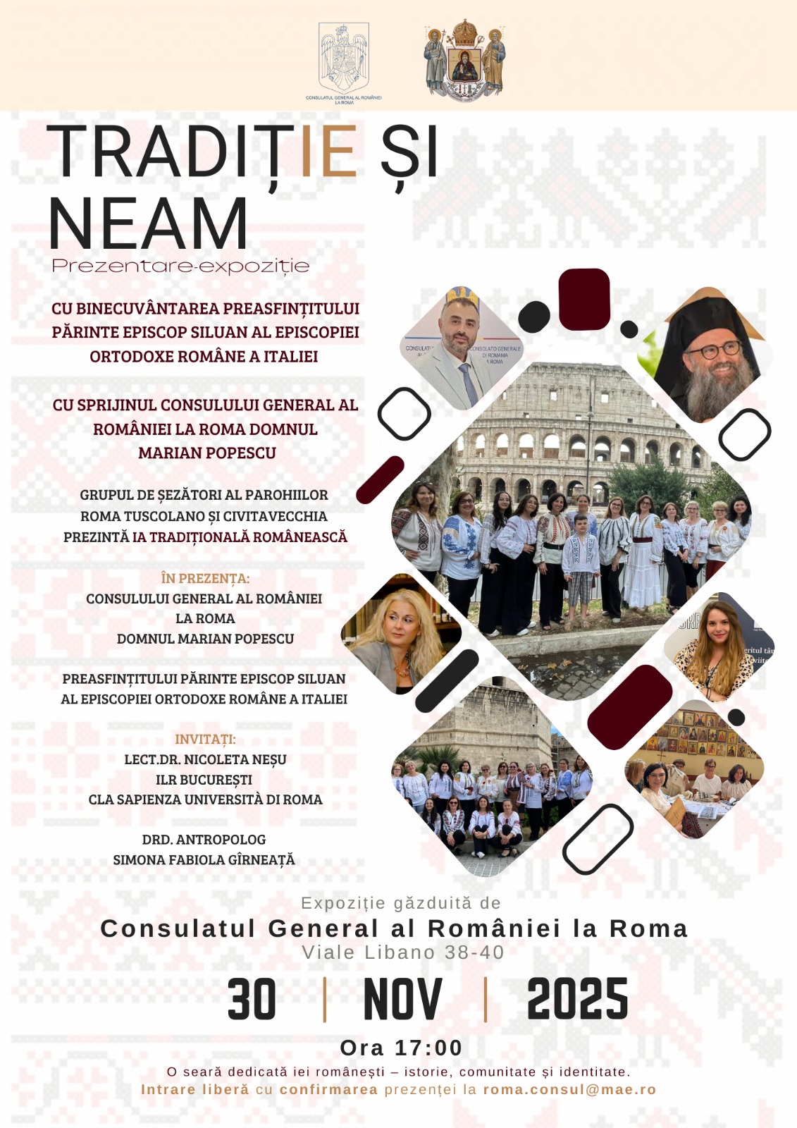 Episcopia Ortodoxă Română a Italiei și Consulatul General al României la Roma vă invită la expoziția grupului de șezători al Parohiilor Roma Tuscolano și Civitavecchia care va prezenta IA tradițională românească, organizată cu scopul păstrării și promovării valorilor și tradițiilor naționale în rândul comunității românești.