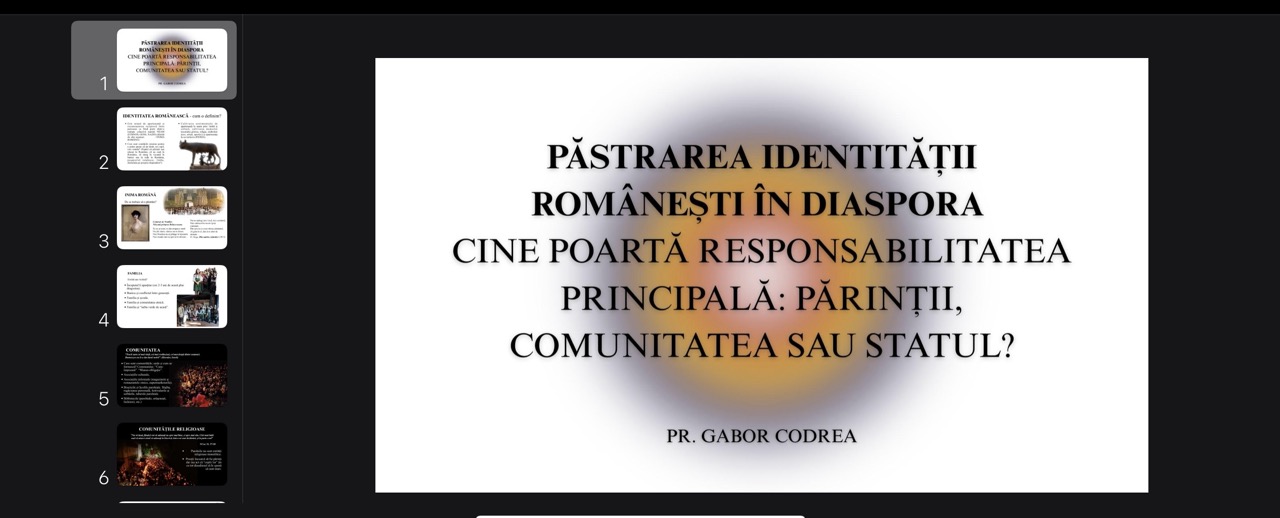 Cu binecuvântarea Preasfințitul Siluan, părintele protopop Gabor Codrea a participat cu o reflecție despre “Păstrarea limbii și identității românești în diaspora – Cine poartă responsabilitatea principală: părinții, comunitatea sau statul?”.
